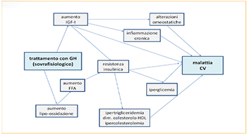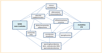 - in bambini obesi con SM, che ha caratteristiche simili alle alterazioni metaboliche del DGH infantile, lo spessore intima-media (IMT) carotideo (indicatore predittivo di infarto miocardico e stroke) è aumentato; nell’adulto con DGH non trattato l’IMT è aumentato e diminuisce sotto trattamento con GH