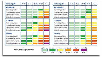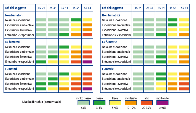 Come dimostrato da vari studi, esistono fattori di rischio diversi dall'esposizione al fumo di tabacco e all'inquinamento per lo sviluppo di BPCO: tra questi annoveriamo i fattori di rischio endogeni, che comprendono l'assetto genetico, l'età, il sesso, la crescita e lo sviluppo polmonare. Per quel che riguarda la trasmissione genetica di fattori predisponenti lo sviluppo di BPCO, è nota da tempo la relazione tra deficit di inibitore delle proteasi seriche, ?1-antitripsina, e rischio di enfisema; l'invecchiamento inoltre facilita lo sviluppo della patologia, sia per il graduale declino della funzionalità respiratoria, sia per l'incremento degli anni di esposizione ad agenti patogeni, mentre il sesso non sembra influire sull'incidenza di malattia, sebbene alcuni studi suggeriscano una maggiore suscettibilità delle donne agli effetti nocivi del fumo di tabacco. La presenza di un'anamnesi positiva per infezioni respiratorie in età pediatrica si associa spesso a quadri di BPCO in età adulta, specialmente se è presente, contemporaneamente, una storia di fumo. Anche una dieta povera di sostanze antiossidanti, come frutta e verdura, e l'abuso di alcool sembrano correlati al rischio di sviluppare patologie respiratorie croniche di tipo ostruttivo. Esistono carte del rischio, relativo e assoluto, divise in base al sesso e alla specifica esposizione a fattore di rischio per malattia. Nella Figura 1 riportiamo le carte per calcolare il rischio assoluto di sviluppare BPCO a 10 anni nella popolazione maschile e femminile.6
