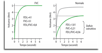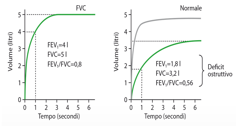 Figura 2. Spirometria normale (a sinistra) e con sindrome ostruttiva (a destra). Da 19.