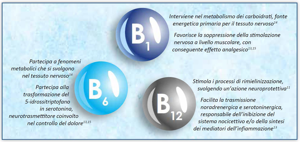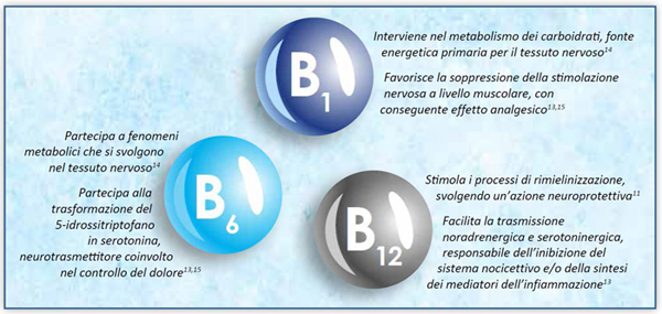 Le vitamine del complesso B, in particolare la B1 (tiamina), la B6 (piridossina) e la B12 (cobalamina), esercitano infatti un'efficace azione analgesica, soprattutto quando assunte in combinazione;12 tale effetto è da attribuire a una maggiore disponibilità e/o efficacia di noradrenalina e 5-idrossitriptamina, neurotrasmettitori che esercitano un'azione inibitoria nella trasmissione del dolore nocicettivo; da sottolineare che queste vitamine inibiscono specificamente alcuni processi fisiopatologici coinvolti nel dolore neuropatico con un effetto analgesico dose-dipendente: a dosaggi più elevati, infatti, corrispondono benefici più immediati e sostenuti sulla sintomatologia algica.13