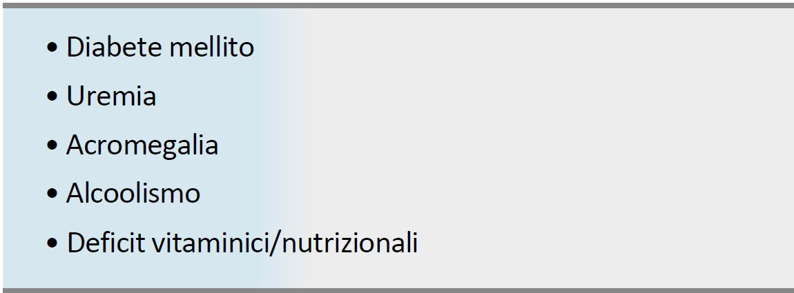 L'alterazione a livello di nervi periferici non si correla col diabete mellito, i livelli di GH o la funzionalità ipofisaria, ma piuttosto con una alterazione del metabolismo del sodio totale corporeo.9
