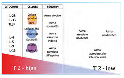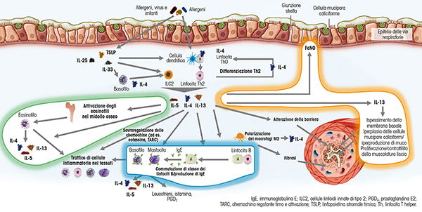 Nell'ambito dell'infiammazione di tipo 2 guidata sia dall'immunità acquisita, principalmente tramite l'intervento dei linfociti T helper di tipo 2 (Th2) CD4+, sia dall'immunità innata, attraverso le cellule linfoidi innate di tipo 2 (ILC2), un ruolo patogenetico fondamentale è svolto dalle interleuchine IL-4, IL-13 e IL-5; queste citochine mediano molte delle risposte cellulari implicate nelle manifestazioni patologiche tipiche dell'asma, quali infiltrazione di cellule infiammatorie, rilascio di mediatori, rimodellamento delle vie aeree. In particolare (Fig. 1):