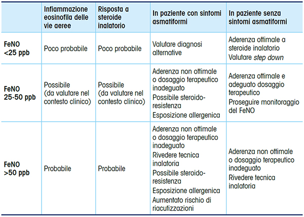 Valori di FeNO elevati sono indice di scarso controllo dell'asma; questo marker rappresenta uno strumento non invasivo e di facile misurazione particolarmente utile nella gestione pratica dell'asma grave e può predire una buona risposta alla terapia antinfiammatoria steroidea, fornendo informazioni sulla compliance del paziente (Tab. 1).