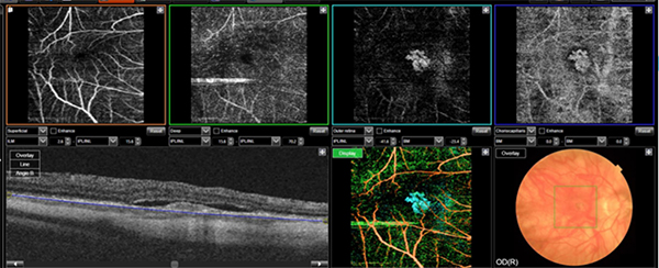 unisce alle scansioni OCT lo studio della rete vascolare retinica e coroideale. L'esame, attraverso lo studio della differenza di reflettività nelle scansioni provocate dal moto dei globuli rossi nei vasi, consente un ricostruzione della rete vascolare. ?? una tecnica diagnostica di ultima generazione, che ci permette di avere esami ad altissima risoluzione. Gli apparecchi sono dotati di un sistema di eye-tracking, un sistema di puntamento oculare che riduce la possibilità di artefatti da movimento. ?? molto utile nelle forme di maculopatia per valutare l'eventuale sviluppo di una neovascolarizzazione.