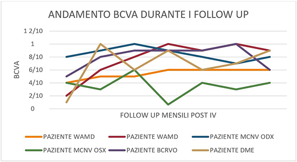 Ogni paziente è stato sottoposto a valutazione della BCVA (best corrected visual acuity) cioè alla valutazione della massima acuità visiva che l'occhio può esprimere.