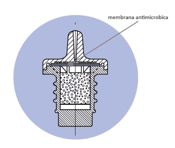 Figura 2. Nel sistema ABAK® una membrana anti-microbica con porosità di 0,2 micron protegge il collirio dalla contaminazione dei microrganismi.