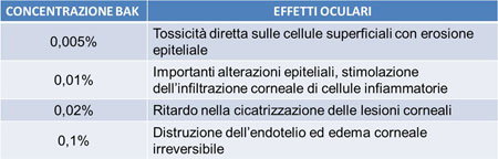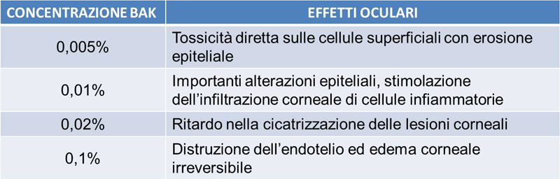 La somministrazione prolungata di BAK risulta dannosa anche per le strutture della cornea, della congiuntiva e dei tessuti annessi, come le palpebre. Il grado di tossicità è strettamente dipendente dalla concentrazione di questo conservante (Tab. 2) e direttamente proporzionale alla durata dell'esposizione.