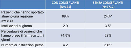 Tabella 5. Reazioni avverse e aderenza al trattamento correlate all'uso di farmaci per la congiuntivite allergica con e senza conservanti