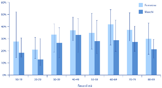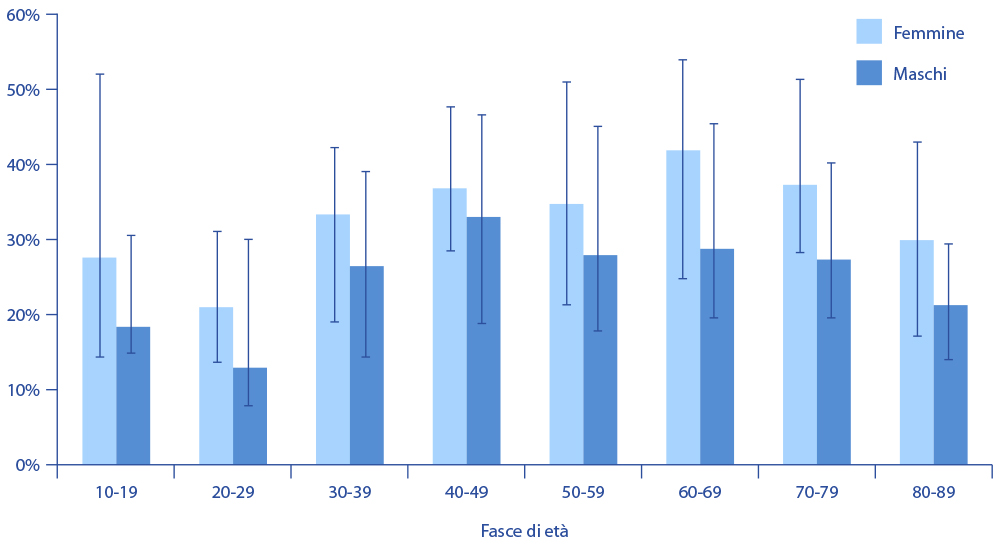 Figura 1. Prevalenza del mal di schiena in base all'età e al sesso.3