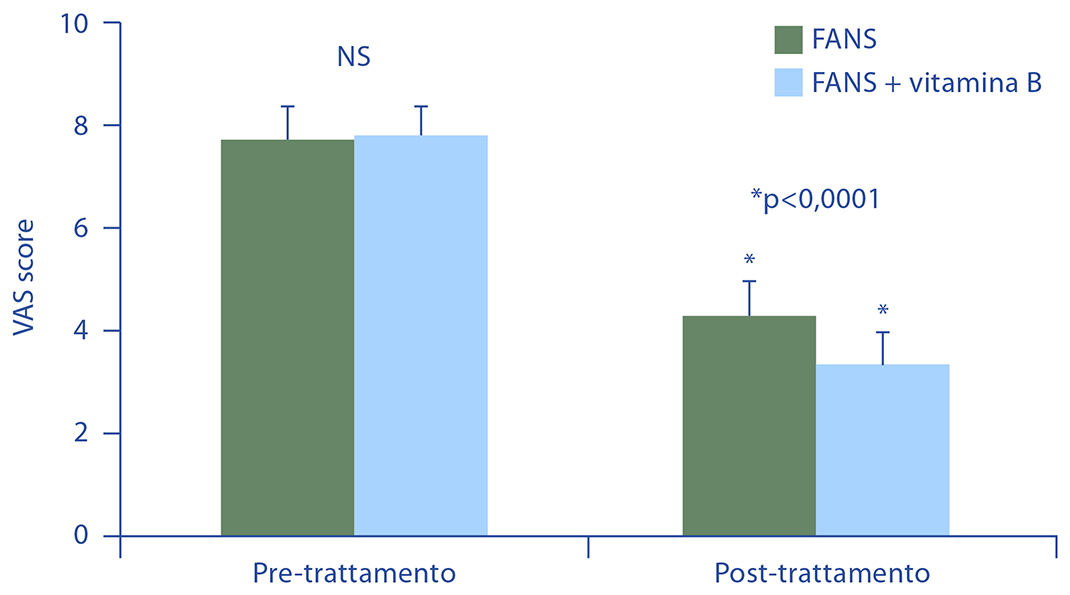Figura 2. Riduzione significativa del dolore lombosciatalgico (misurato con scala analogico visiva del dolore, VAS) dopo trattamento combinato FANS + complesso vitaminico B per un periodo mediano di 7 giorni.2