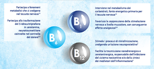 Le vitamine B1, B6 e B12 esercitano un effetto antinfiammatorio determinando un'inibizione sulla sintesi di mediatori dell'infiammazione.2,8,10,11 Le evidenze scientifiche mostrano che la vitamina B1 è in grado di associare a una rilevante azione analgesica una significativa attività antinfiammatoria,10 e che livelli plasmatici ridotti di vitamina B6 si associano a patologie infiammatorie croniche quali l'artrite reumatoide.11 ?? stato dimostrato che la vitamina B12 esplica la sua azione antinfiammatoria inibendo l'azione di mediatori quali l'NF-kB e l'ossido nitrico, e favorendo la fosforilazione ossidativa.12
