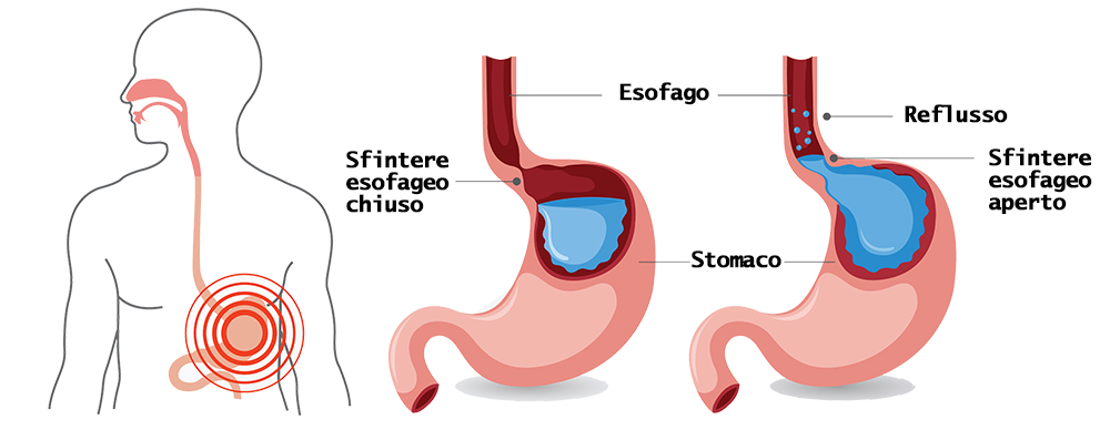 All'estremità inferiore dell'esofago è presente una valvola (sfintere esofageo inferiore) che si rilascia dopo la deglutizione per permettere il passaggio del cibo nello stomaco e, richiudendosi, impedisce il percorso inverso. Se la valvola non funziona correttamente, si può verificare reflusso di contenuto gastrico (acido cloridrico, alimenti e bile) dallo stomaco all'esofago (Fig. 1).