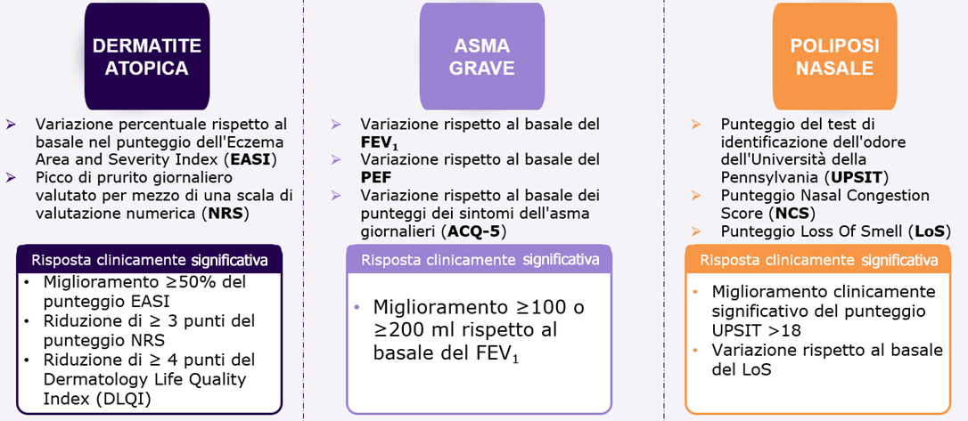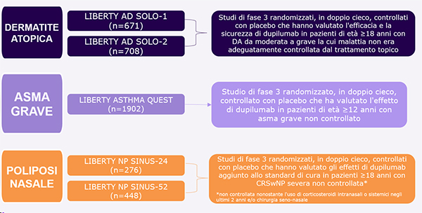 Il trattamento con dupilumab si è associato a miglioramenti clinici statisticamente significativi già dopo la prima dose e indipendentemente dalla patologia considerata. Questi effetti si sono protratti in maniera costante fino al termine del trattamento.1 Questi risultati rispecchiano la rapida e prolungata soppressione dei biomarcatori dell'infiammazione di tipo 2 che fa seguito al trattamento con dupilumab in ogni condizione considerata.1