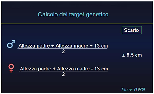 Un bambino viene definito "di bassa statura" quando la sua altezza si colloca al di sotto del 3° percentile secondo le curve auxologiche comunemente utilizzate (1). Ciò significa che, considerati 100 soggetti della stessa età e sesso, egli si trova tra i 3 bambini più piccoli. Per bassa statura può anche intendersi una statura che si colloca ben al di sotto di quello che è definito il "target genetico": l'altezza predisposta in quel bambino sulla base del patrimonio genetico familiare, ossia le altezze dei genitori (Fig. 1).