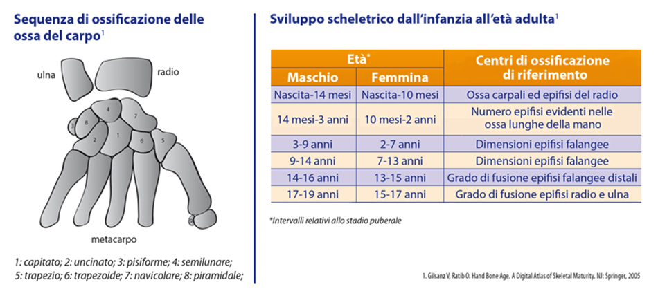 Nella diagnosi differenziale tra le condizioni di bassa statura sarà inoltre utile disporre della valutazione della maturità scheletrica utilizzando una radiografia della mano, che può non solo confermare la presenza di un ritardo accrescitivo, ma anche quantificare il restante potenziale accrescitivo (Fig. 2).