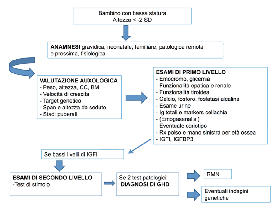 Una volta escluse tutte le cause menzionate, in presenza di parametri auxologici suggestivi di deficit dell'ormone della crescita (GHD), il pediatra dovrà inviare il bambino ad un centro specialistico per l'esecuzione dei test diagnostici di conferma (Fig. 3).