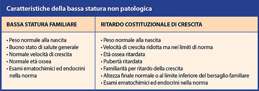 Per tali motivi, la bassa statura o lenta velocità di crescita in un bambino devono sempre imporre un attento esame clinico, con una valutazione nello specifico momento della visita che tenga conto dei parametri rilevati nel corso degli eventuali controlli precedenti, associata alla considerazione delle caratteristiche familiari. Infatti, un progressivo rallentamento della velocità di crescita, pur con statura ancora nei limiti di norma, o una deviazione del ritmo accrescitivo dal suo centile nelle curve auxologiche possono essere manifestazioni cliniche di una patologia.