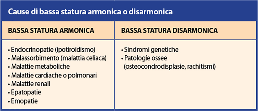 Di fondamentale importanza è anche individuare il periodo esatto del rallentamento della crescita, e se esso è avvenuto improvvisamente o in modo graduale. Il pediatra dovrà inoltre valutare se si tratta di un bambino con bassa statura "armonica" o "disarmonica": quest'ultima deve indirizzare alla presenza di sindromi genetiche o patologie ossee; nel primo caso, invece, possono essere coinvolte le due condizioni endocrine di bassa statura più frequenti, ossia l'ipotiroidismo e la malattia celiaca, oltre che una serie di altre patologie a carico di diversi organi e apparati (Tab. 2).