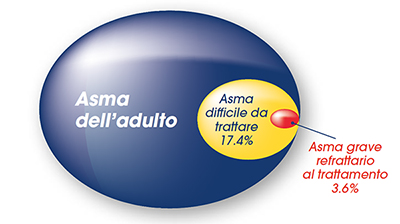 In generale, si può dire che esiste una popolazione scarsamente responsiva ai trattamenti ai quali rispondono invece la maggior parte dei pazienti asmatici: si parla allora di asma difficile da trattare, ovvero dei casi che non risultano controllati nonostante il trattamento degli step 4 e 5 GINA (per esempio, dose medio-alta di ICS più un secondo controller; terapia di mantenimento con OCS) oppure che necessitano di questo trattamento per raggiungere e mantenere un buon controllo dei sintomi e ridurre il rischio di riacutizzazioni. In questo ambito troviamo un sottogruppo di pazienti, pari al 3,6%, che risulta affetto da asma grave refrattario al trattamento (