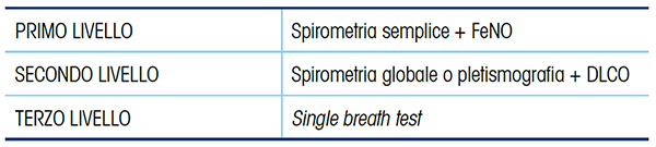Tabella 1. Test funzionali ventilatori per la valutazione del paziente affetto da asma grave (DLCO: diffusione alveolo-capillare del monossido di carbonio; FeNO: frazione di ossido nitrico esalata)