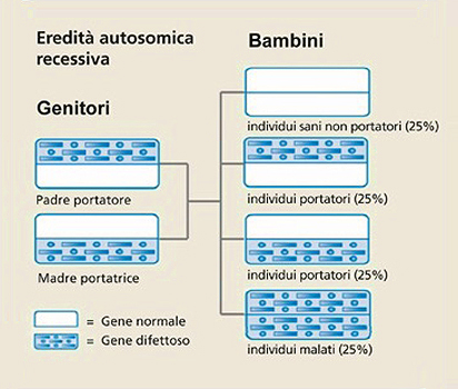 La malattia di Pompe, nota anche come deficit di maltasi acida (acid maltase deficiency, AMD) o glicogenosi di tipo II (glycogen storage disease type II, GSDII),3 è una malattia genetica a trasmissione autosomica recessiva causata da una mutazione del gene sul braccio lungo del cromosoma 17; si può manifestare quando entrambi i genitori sono portatori del gene mutato (Fig. 1).