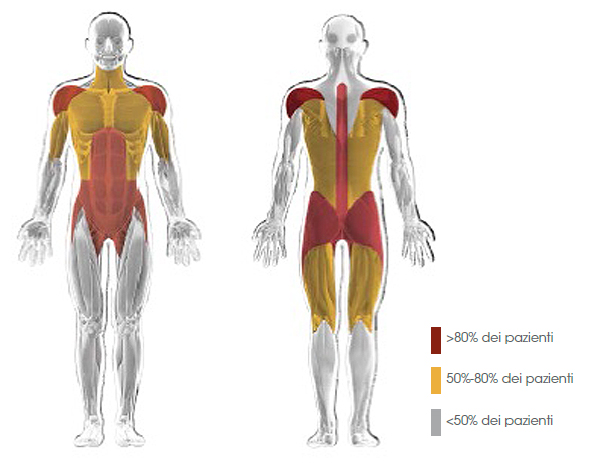 ?? il quadro clinico più comune; i muscoli degli arti, in particolare degli arti inferiori, e del tronco sono interessati precocemente nel corso della malattia (Fig. 3).12