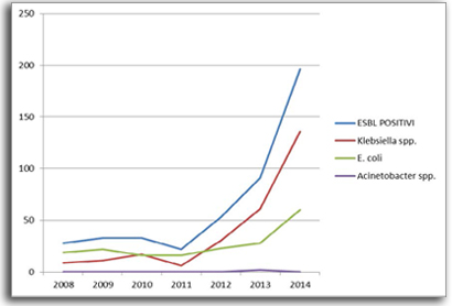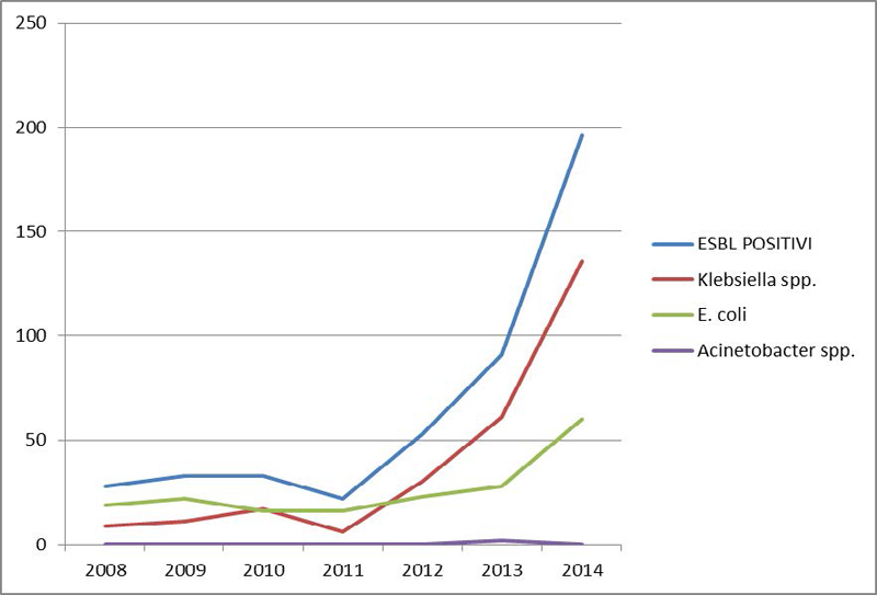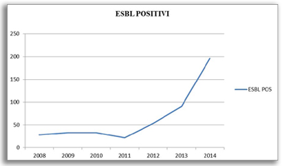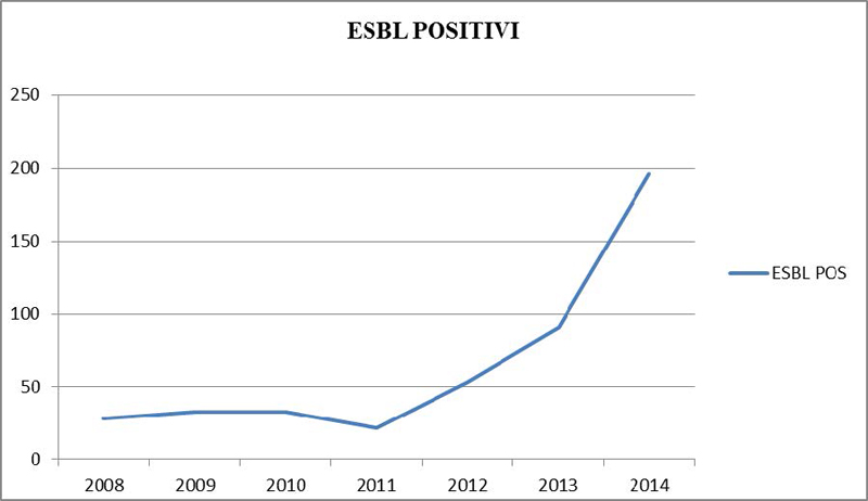 Figura 1. Andamento delle ESBL nel periodo 2008-2014 presso il P.O. "G. Moscati".
