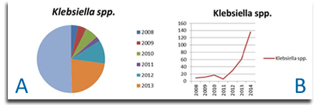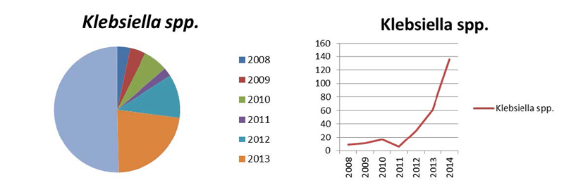 Figura 3. Incidenza di Klebsiella spp. presso il P.O. "G. Moscati" nel periodo 2008-2014.