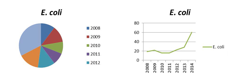 Figura 4. Incidenza E. coli presso il P.O. "G. Moscati" nel periodo 2008-2014.