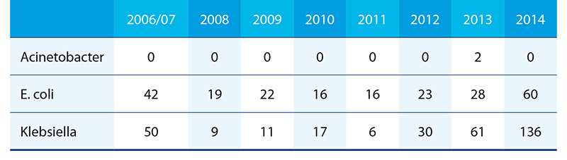 Figura 2. Andamento delle diverse specie di ESBL nel periodo 2008-2014 presso il P.O. "G. Moscati".