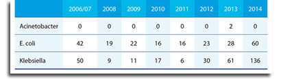 L'Acinetobacter spp. solo in due casi ha mostrato la capacità di produrre ESBL. Per quanto riguarda le altre due specie batteriche, K. pneumoniae ed E. coli, nel periodo 2008-2014 hanno avuto un trend di crescita elevato. Questo fenomeno era stato notato anche in passato e, infatti, uno studio condotto presso il P.O. "Moscati" di Aversa nel biennio 2006-2007, lasciava presagire che il numero dei germi ESBL fosse destinato ad aumentare. I dati dai noi ottenuti non fanno altro che confermare quanto già detto in precedenza e, inoltre, sono in accordo con dati di altre realtà ospedaliere.8 Siccome questi patogeni sono anche stabili a temperatura ambiente e su diverse superfici, essi albergano nei nosocomi e, per tale motivo, stanno aumentando le campagne volte alla sensibilizzazione e all'istruzione del personale, in modo da limitare quanto più possibile la loro diffusione accidentale. Attualmente sono in atto numerosi studi volti a ridurre la diffusione di tali germi o, perlomeno, a cercare qualche molecola nuova che possa segnare la svolta nella lotta contro di essi. L'unica soluzione che sembra al momento applicabile è testare la sinergia tra più tipi di antibiotici, in modo da valutare se l'azione combinata di due o più molecole possa realmente essere di beneficio, non solo in vitro, ma, soprattutto in vivo. Alcuni studi riportano un sinergismo significativo tra classi di antibiotici come colistina e tigeciclina, in associazione con rifampicina.9 In un altro recente studio, invece, si è posta l'attenzione sul sinergismo tra vancomicina e colistina,10 che ha dato discreti risultati, come quello tra meropenem e colistina.11 L'analisi che però lascia ben sperare è stata condotta da Safarika e collaboratori, i quali hanno studiato il sinergismo tra colistina e levofloxacina. Questa sinergia ha dato una percentuale di successo molto alta, anche se non per tutte le specie in questione.12