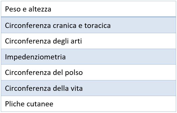 Di particolare utilità risultano anche altri indicatori di massa, detti parametri antropometrici, come la valutazione delle pliche cutanee (plicometria) e la misurazione di alcune circonferenze, come la circonferenza vita, considerati indici di grasso viscerale. Dal punto di vista strumentale è utile l'utilizzo della tecnica impedenziometrica, che misura la quantità di liquidi e massa magra del bambino, con conseguente valutazione della massa grassa (Tab. 1).