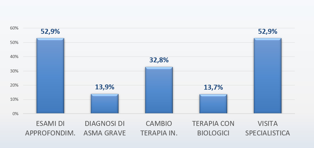 I dati raccolti dai Centri evidenziano che poco più della metà dei pazienti erano stati sottoposti in precedenza a un esame spirometrico. Durante le consulenze gli specialisti hanno proposto di eseguire esami di approfondimento a circa la metà dei pazienti; hanno comunicato un sospetto di diagnosi di asma grave nel 14% circa dei casi; hanno parlato di un possibile cambio della terapia inalatoria in un terzo dei pazienti; hanno informato i pazienti della disponibilità di una terapia biologica per l'asma grave nel 13,7% dei casi; e hanno consigliato di fissare un appuntamento per una visita specialistica a oltre la metà dei pazienti (Fig. 2).