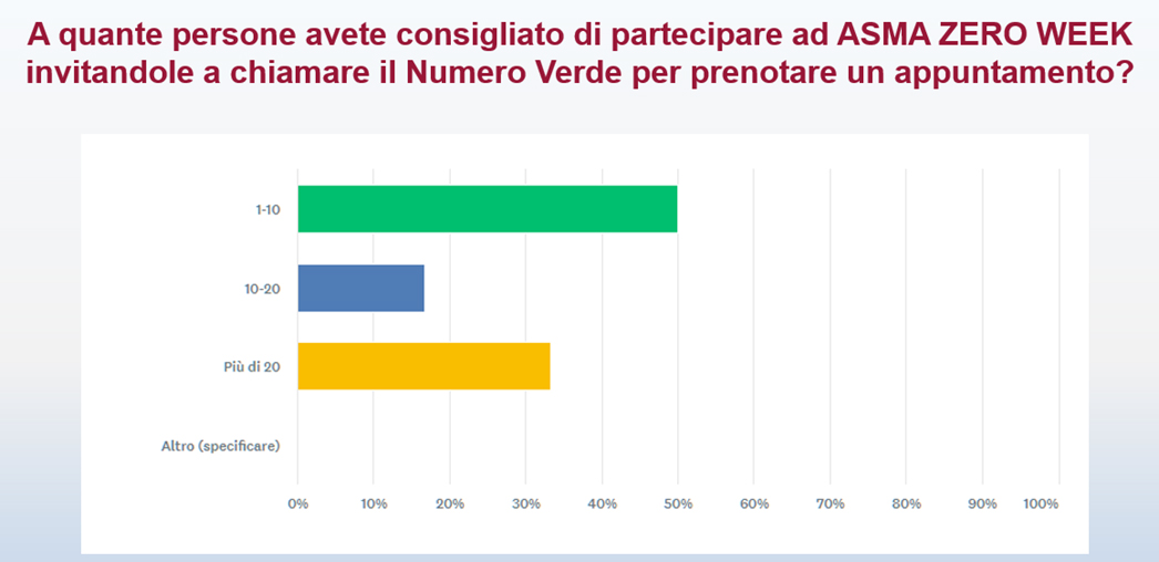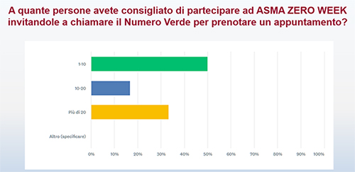 Importante il risultato in termine di "fidelizzazione" ai Centri da parte dei pazienti: dopo ASMA ZERO WEEK il 24% dei soggetti asmatici coinvolti ha effettuato una visita specialistica o degli esami presso la struttura in cui aveva ricevuto la consulenza. E importante anche il risultato in termini di miglioramento della qualità di vita delle persone affette da asma: nel 77,5% dei pazienti per i quali gli specialisti avevano formulato un sospetto diagnostico di asma grave è stata confermata la diagnosi, consentendo l'identificazione di un percorso terapeutico più appropriato per il paziente.