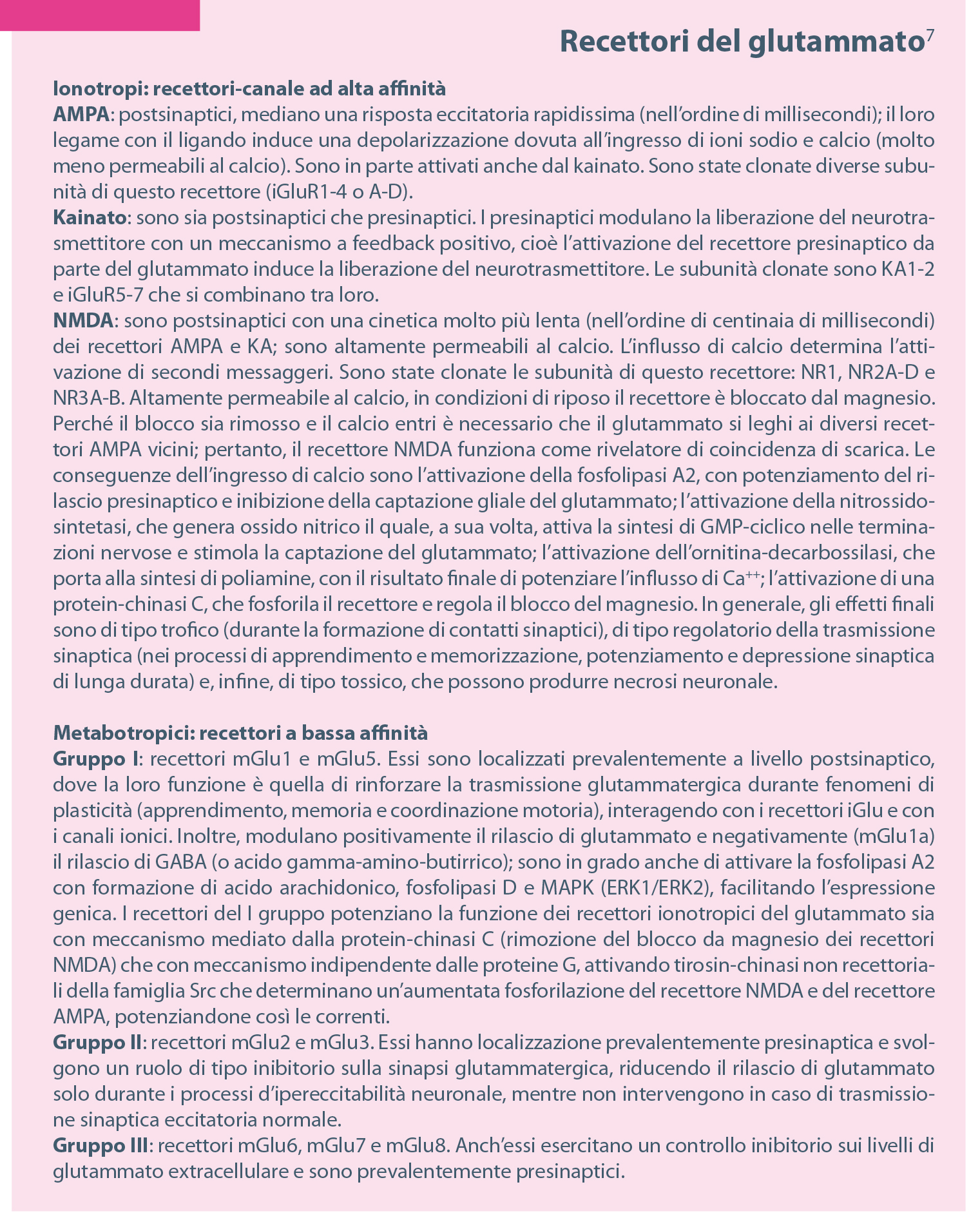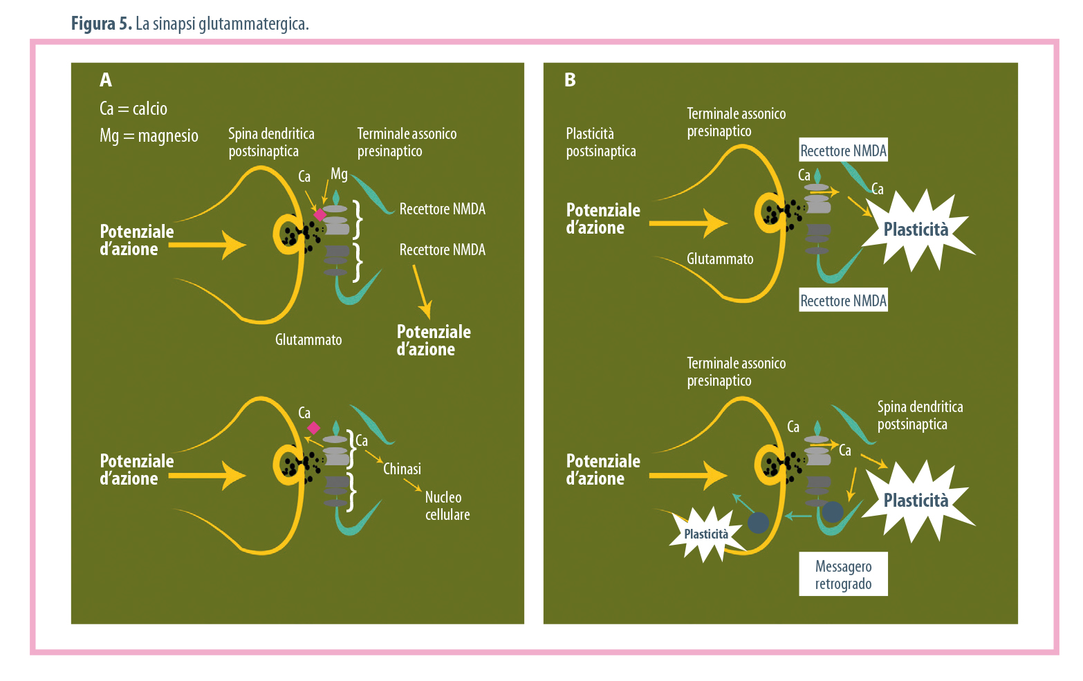 Gli studi successivi hanno definito il fun­zionamento della sinapsi glutammatergi­ca, illustrato dalla Figura 5.