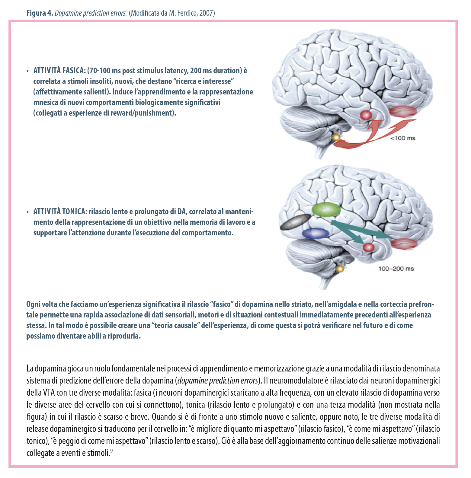 La memoria di lavoro, o memoria ope­rativa o memory working, può essere defi­nita un database temporaneo (memoria a brevissimo termine) per la conservazione delle informazioni per il tempo necessa­rio a completare un'azione. Lo span è la capacità della memoria di lavoro, cioè il numero di elementi che può utilizzare a un dato istante, in genere sette. La memoria di lavoro, distribuita in subregioni della CPF, soprattutto nella CPF dorsolaterale, è il trait d'union fra la dimensione percettiva e quella cognitiva cosciente del cervello. Subsistemi separati di memory working inviano, dalle aree corticali sensoriali (visiva, uditiva ecc.), informazioni alla CPF dorsola­terale, che le integra in modalità multimo­dale.(2) La dopamina modula le funzioni della memoria di lavoro influenzando l'attenzio­ne selettiva: la stimolazione dei recettori corticali del sottotipo D1-like (D1-D5), postsinaptici, ad alta affinità di legame, si traduce in una facilitazione dei pattern di scarica dei neuroni che devono lavorare, riconosciuti in base al loro stato elettrico, mentre quelli non utili al momento vengo­no inibiti dalla stimolazione dei recettori presinaptici a bassa affinità, del sottotipo D2-like (D2-D3-D4).(3) In sintesi, la dopamina "dosa" il numero d'impulsi generati nelle aree prefrontali della memory working e provocati dalle informazioni provenienti dalle regioni sensoriali. Quando il compito è stato svolto, output inibitori dai neuroni dei sistemi motori, sia corticali sia subcor­ticali, inibiscono le cellule dopaminergiche della VTA. Avete mai studiato in un am­biente rumoroso, per esempio in treno? Certamente sì. Ebbene, ci siete riusciti gra­zie a questa capacità del cervello!